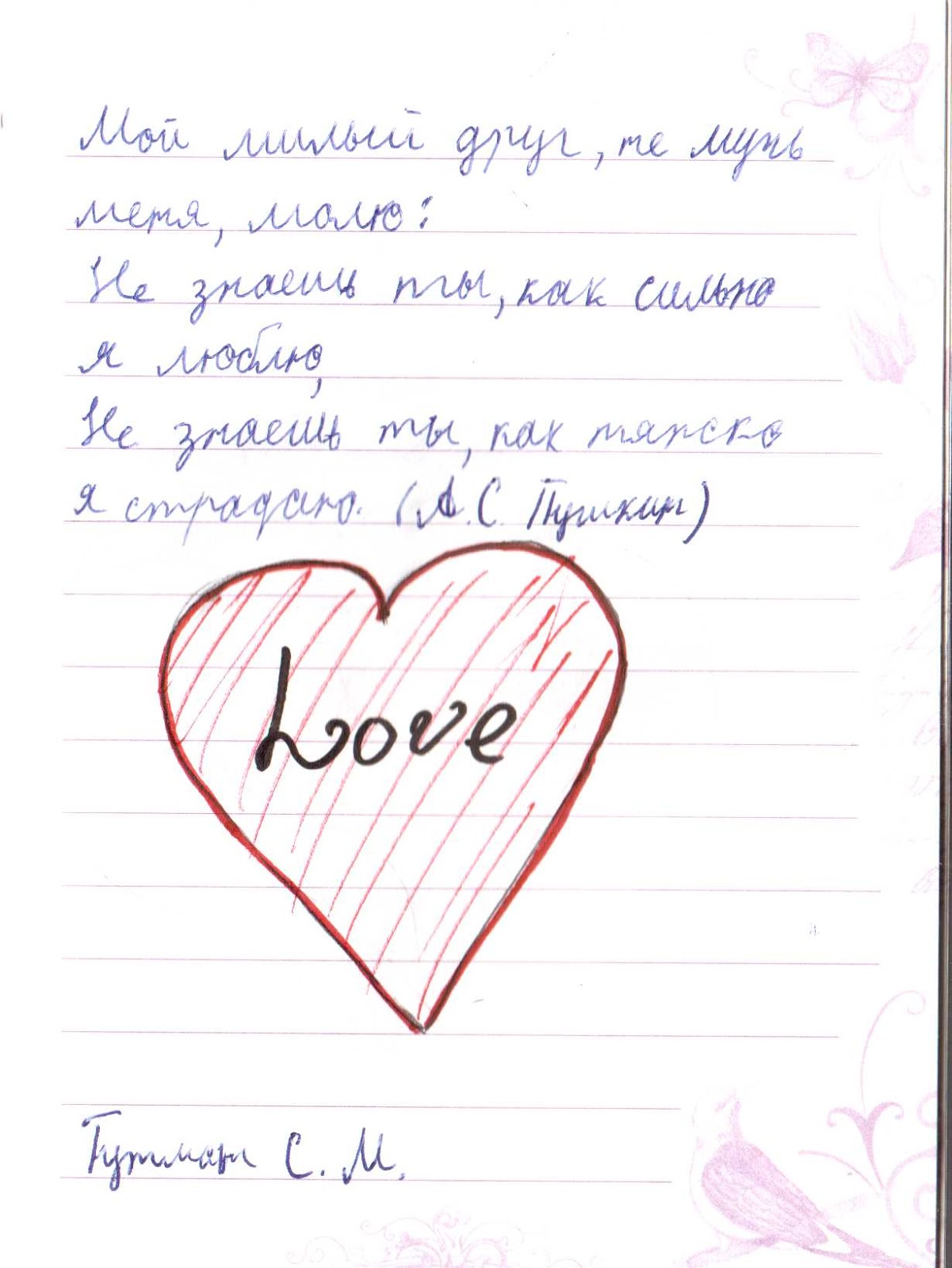Оказалось, без Пушкина современный старшеклассник не может говорить о любви и красоте. Посмотрите: в нашем альбоме что ни страница - стихи А.С. Пушкина, старательно переписанные и проиллюстрированные. НАШ Пушкин! Сегодня и на всю жизнь!